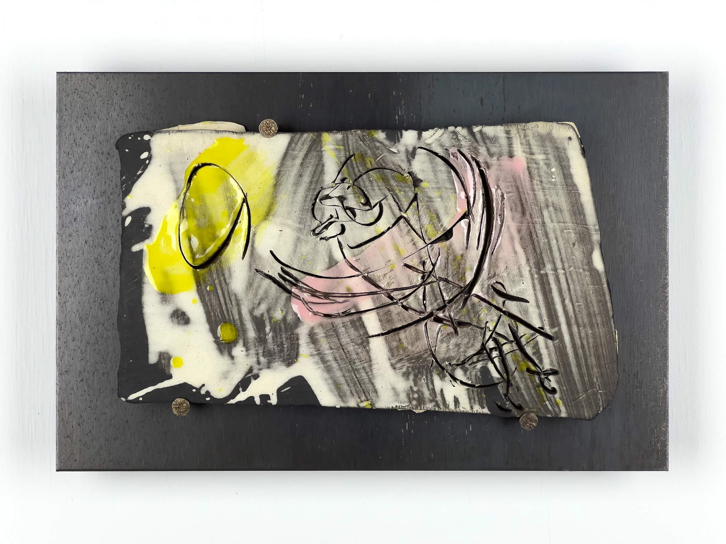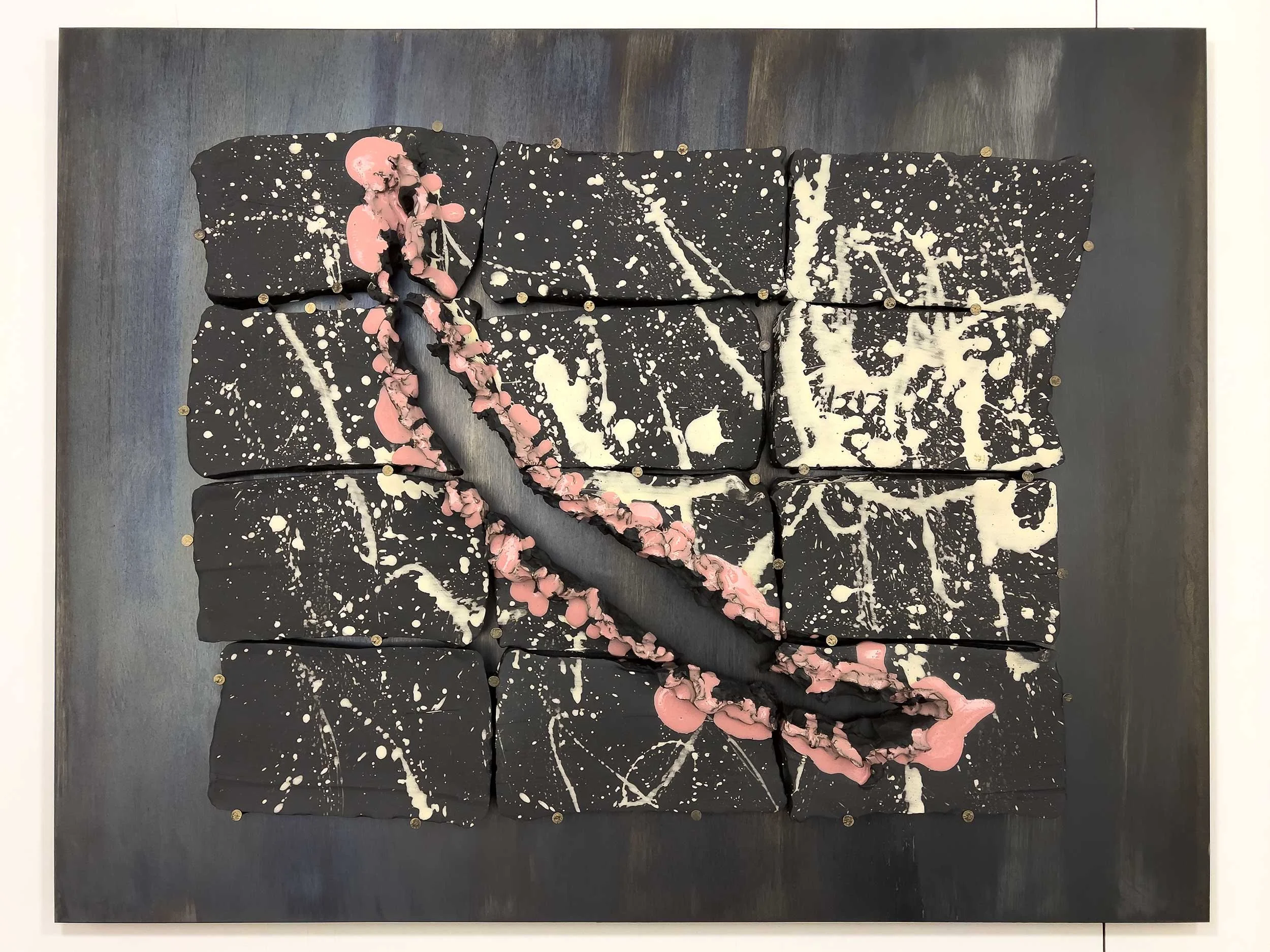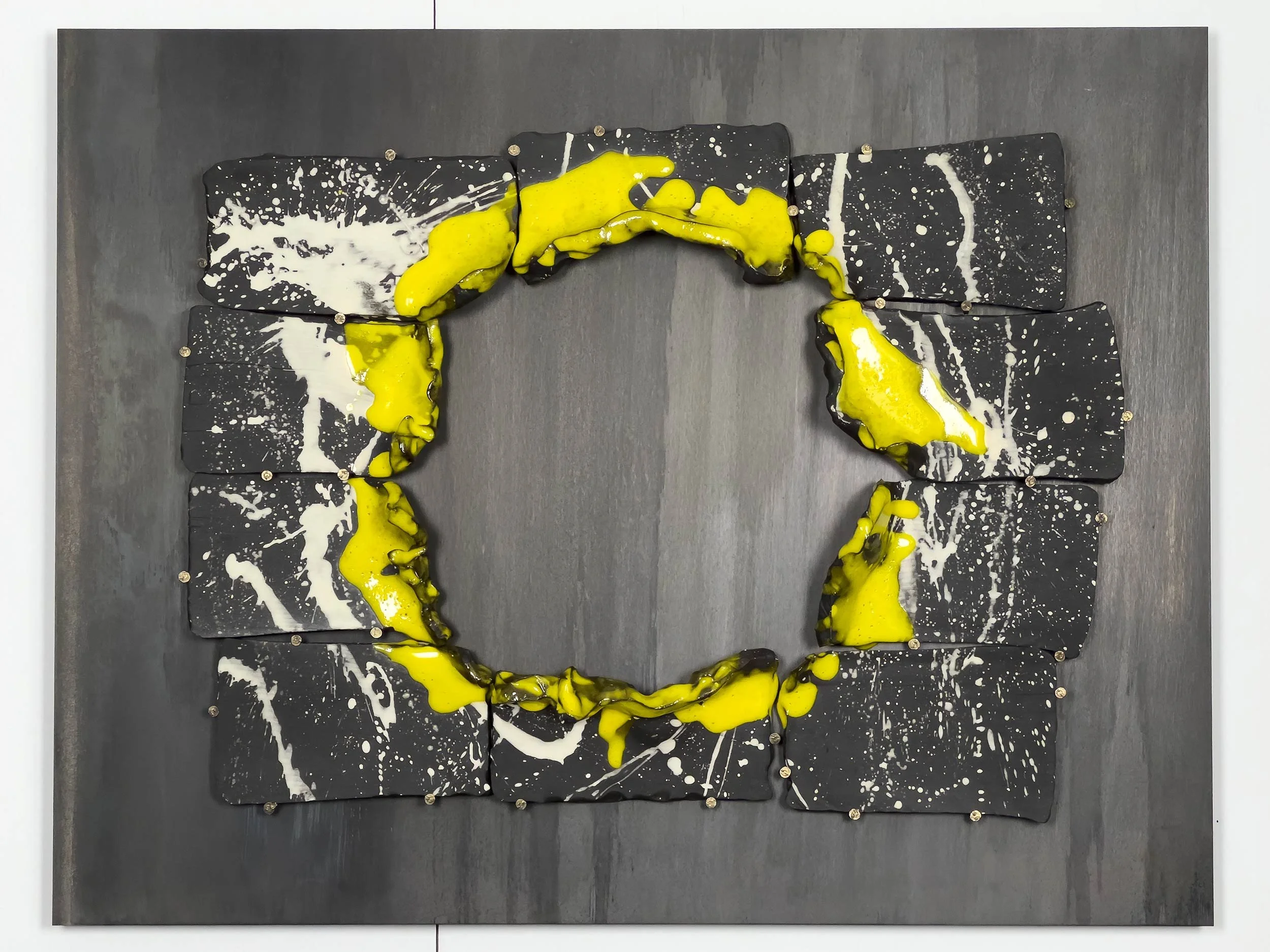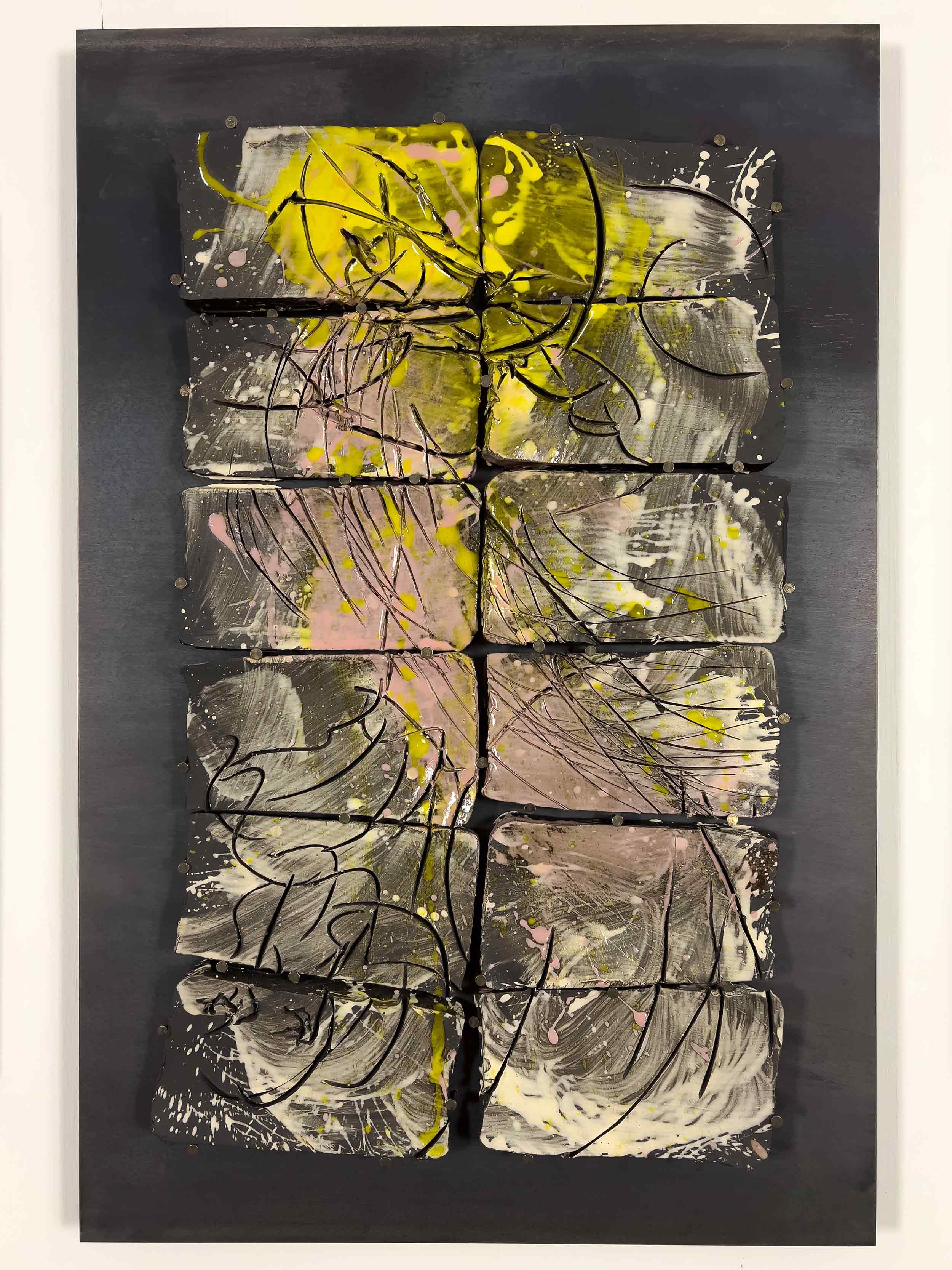 Engobe and Glaze on Ceramic, masonry nails, mounted on 12-gauge hot-rolled steel plates