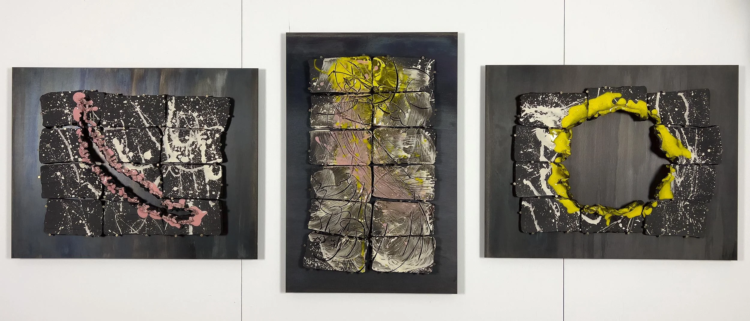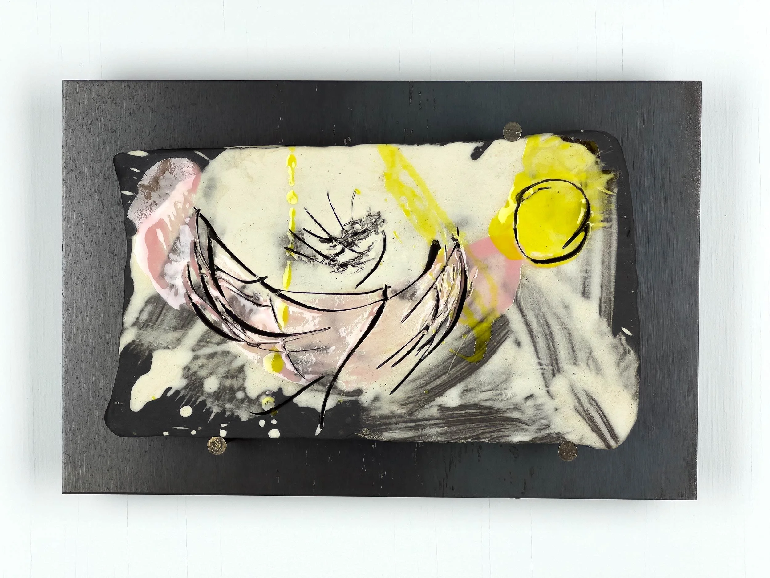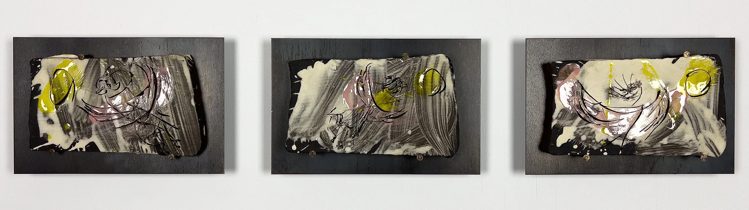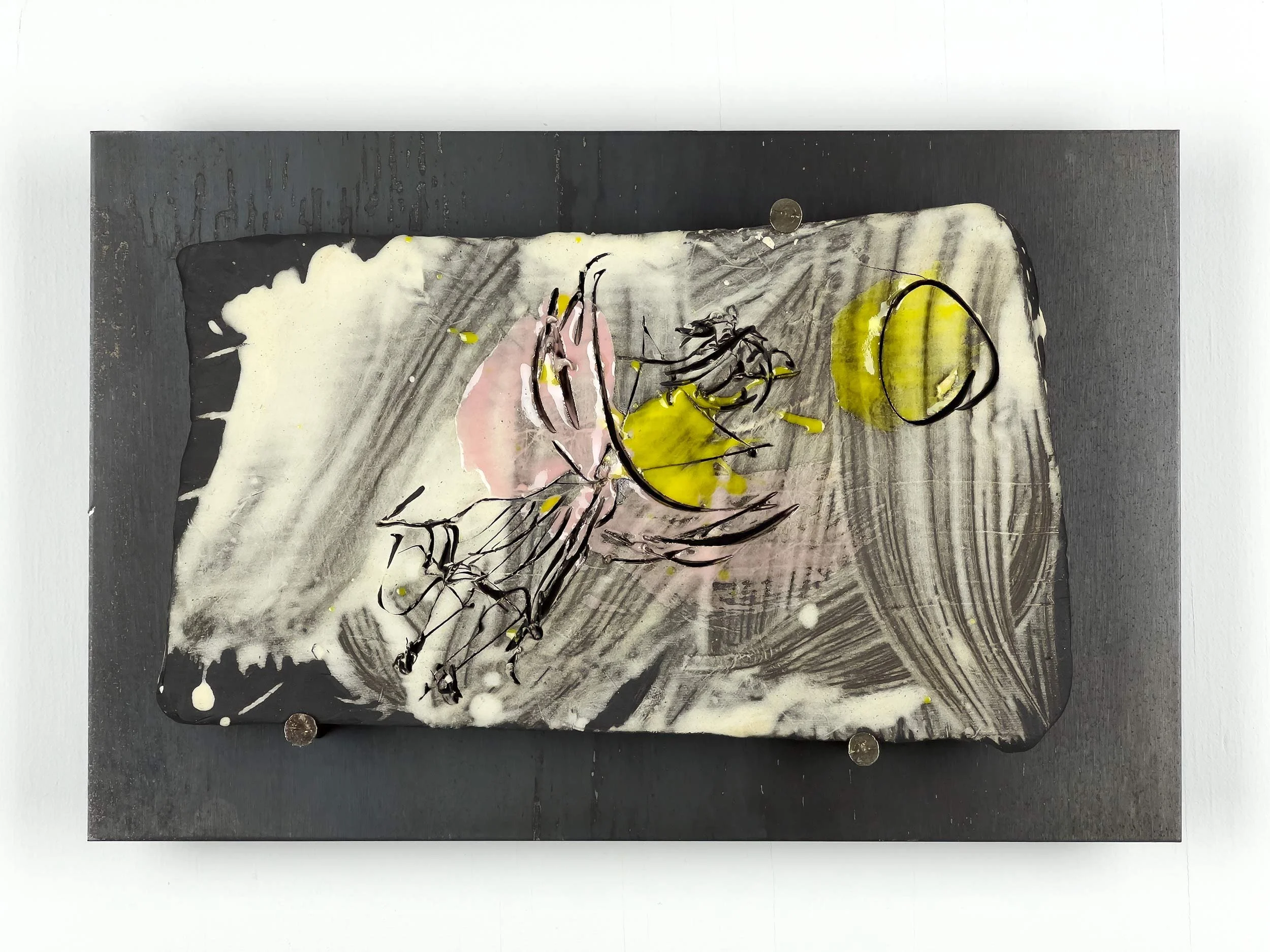 Engobe and Glaze on Ceramic, masonry nails, mounted on 12-gauge hot-rolled steel plates